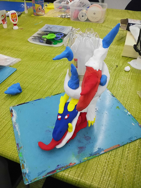 2013年は共同制作で「天空の城」をテーマにモビールを作成し、天井から吊るして展示しました。その他、夏に制作したマリンドラムやスキージの技法を使った空想画なども展示しました。ワークショップでは「深海の生き物」をテーマに作品をつくり、その作品を、参加者みんなでモビール風に吊るして仕上げました。