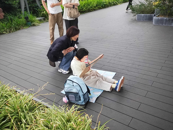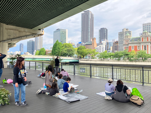 今回の写生会の会場は、ネオ・ルネッサンス様式の美しい建物として知られる大阪市中央公会堂。当日は中央公会堂から対岸の西天満若松浜公園へ移動し、中之島の街並みや公会堂の荘厳な姿、目の前を流れる川や新緑の風景を五感で感じながら、子どもたちは思い思いに画用紙へクレパスを走らせました。